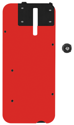 Red rectangular object with black hardware pieces.