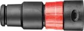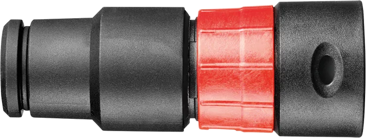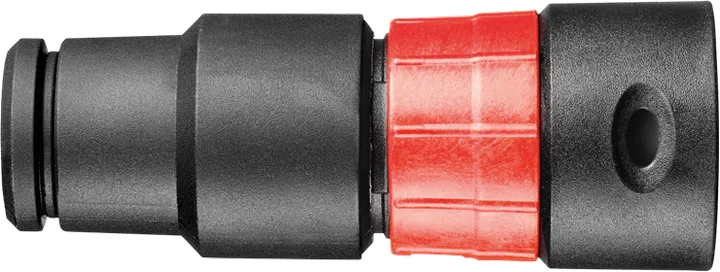 Power tool hose adapter connects to the hose with the Bosch quick click system. The rubber nozzle is sized to be used for a friction fit on nearly all Bosch dust collection attachments. The power tool hose adapter has a slider that is used to regulate air flow for optimal dust collection, specifically for applications like sanding that may require lower suction to prevent the tool from sticking to the work piece.