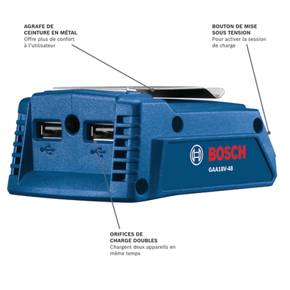 - Compatible et polyvalent : Fonctionne avec les batteries Lithium-Ion Bosch de 18 V et permet d’alimenter n’importe quel(s) appareil(s) 5 V USB ou 12 V DC