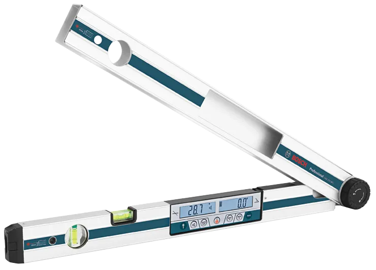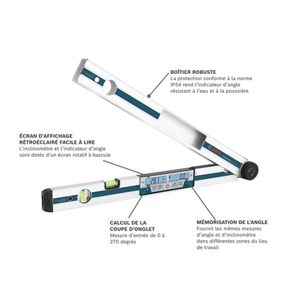 Le détecteur d’angle numérique et inclinomètre Bosch GAM 270 MFL représente cinq outils en un : un détecteur d’angle numérique, un inclinomètre, un calculateur de coupe d’onglet, un rapporteur d’angle et un niveau. Le détecteur d’angle fournit des objectifs d’angle précis, alors que l’inclinomètre fournit des mesures précises en degrés. L’outil est également équipé d’un laser intégré, qui permet à l’utilisateur de transférer les mesures d’inclinaison jusqu’à 100 pi. L’outil a deux écrans éclairés faciles à lire qui pivotent, un pour l’inclinomètre et l’autre pour le détecteur d’angle. Les utilisateurs peuvent facilement réutiliser et transférer les mesure enregistrées avec la fonction d’enregistrement. Le calculateur de coupe fournit des ajustements d’angle de scie faciles ainsi qu’un calculateur d’onglet cumulé. Les utilisateurs peuvent trouver un angle d’onglet en utilisant les pieds de l’outil, qui ont une plage d’angles comprise entre 0 et 270°. Le calculateur d’onglet est utilisé pour mesurer les angles d’assemblages qui ne sont pas perpendiculaires. L’outil a des boutons clairement étiquetés pour des calculs faciles. Le détecteur d’angle est doté d’un boîtier robuste avec protection IP 54.