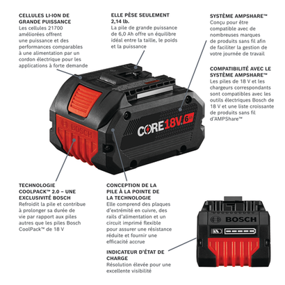 La batterie High Power CORE18V® 6 Ah offre 50 % d’autonomie en plus et 75 % de puissance en plus que la batterie CORE18V® 4 Ah pour les applications très exigeantes. Très performante, la batterie GBA18V60 possède deux rangées de cellules 21700 perfectionnées. Elle dispose de la technologie CoolPack™ 2.0 (une exclusivité Bosch) lui permettant de refroidir plus rapidement et lui conférant une longévité plus élevée que les batteries 18V Bosch sans la technologie CoolPack™ 2.0. Dotée d’un design innovant (plaques d’extrémité et bandes de connexion en cuivre, circuit imprimé souple), elle se distingue par une faible résistance interne et un bon rendement. Très légère avec seulement 2,14 lb, elle offre le compromis idéal entre taille, poids et puissance. Elle intègre un indicateur d’état de charge à haute résolution pour une bonne visibilité. Cette batterie de 18V est compatible avec tous les outils 18V Bosch. Spécialement optimisée pour alimenter les outils PROFACTOR™ Bosch avec technologie BITURBO Brushless™, la GBA18V60 permet de disposer d’une puissance équivalente à celle des outils filaires les plus exigeants. La batterie est compatible avec les chargeurs 18V Bosch et le système AMPShare™. Le système AMPShare™ est conçu pour offrir une compatibilité multimarques et permettre l’utilisation des batteries sur de très nombreux produits sans fil afin de vous faciliter le travail au quotidien.