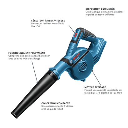 Le souffleur 18V Bosch GBL18V-71N est un souffleur sans fil puissant et pratique qui allie compacité et débit d’air élevé. Son débit d’air de 71 pi³/min et la vitesse de l’air de 167 mi/h permettent de travailler rapidement. Il est fourni avec différentes buses. Il dispose de deux vitesses pour un dosage précis du débit d’air et d’un très bon rapport poids/performances. Ce souffleur est doté d’un moteur performant qui assure une grande autonomie : 8 minutes par Ampère-heure (Ah) de la batterie à basse vitesse et 3,5 minutes par Ah à grande vitesse.