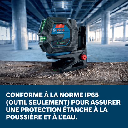 Le laser croix auto-nivelant 12 V Max à faisceau vert et points d'aplomb GCL165-82CGL de Bosch allie une grande souplesse d'alimentation et la technologie laser vert permettant de projeter des lignes jusqu'à 4 fois plus lumineuses que les faisceaux rouges standard. Utilisez la batterie 12 V max incluse ou des piles AA (vendues séparément) pour une plus grande polyvalence et une plus longue durée d'utilisation. La technologie VisiMax™ surveille la température et la consommation électrique afin de fournir la ligne la plus lumineuse, d'optimiser l'efficacité énergétique et d'assurer la fiabilité de l'outil à long terme. Le boîtier recouvert de caoutchouc protège les points d'impacts principaux. Doté d’un indice de protection IP65 (outil seulement) et d’un boîtier avec renfort en caoutchouc, il ne craint ni l’eau ni la poussière. Le bouton de réglage fin et la rotation du pivot permettent un alignement précis point par point en permettant au laser de tourner autour du point pendant la rotation. La fenêtre laser en forme de U permet de disposer d’un angle d’ouverture plus grand pour la ligne horizontale. Les faisceaux lumineux fins à 125 pi de portée offrent une précision de 1/8 po à 30 pi de distance. Une cellule de réception vendue séparément permet d'étendre la portée à 330 pi (pour la ligne horizontale). Le système de calage pendulaire intelligent permet l’auto-nivellement de l’outil et signale quand celui-ci n’est pas à niveau. Le système se bloque automatiquement lors de la mise hors tension de l’outil pour un transport en toute sécurité. Grâce à la connectivité Bluetooth®, le laser peut être piloté via un téléphone mobile et l’application Bosch gratuite « Levelling Remote ». La base avec renforts en caoutchouc permet de stabiliser le laser et les aimants puissants ou le support de montage à filet de ¼ po permettent de le positionner facilement. Autonomie d'une durée remarquable de 8 heures (avec une batterie Li-Ion) pour une productivité continue toute la journée.