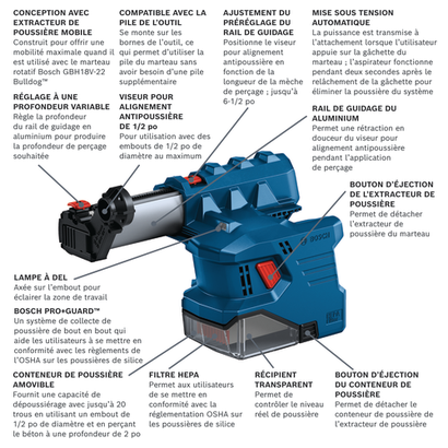 - Collecteur de poussière mobile : construit pour offrir une mobilité maximale utilisé avec le perforateur Bosch 18V GBH18V-22 Bulldog™
