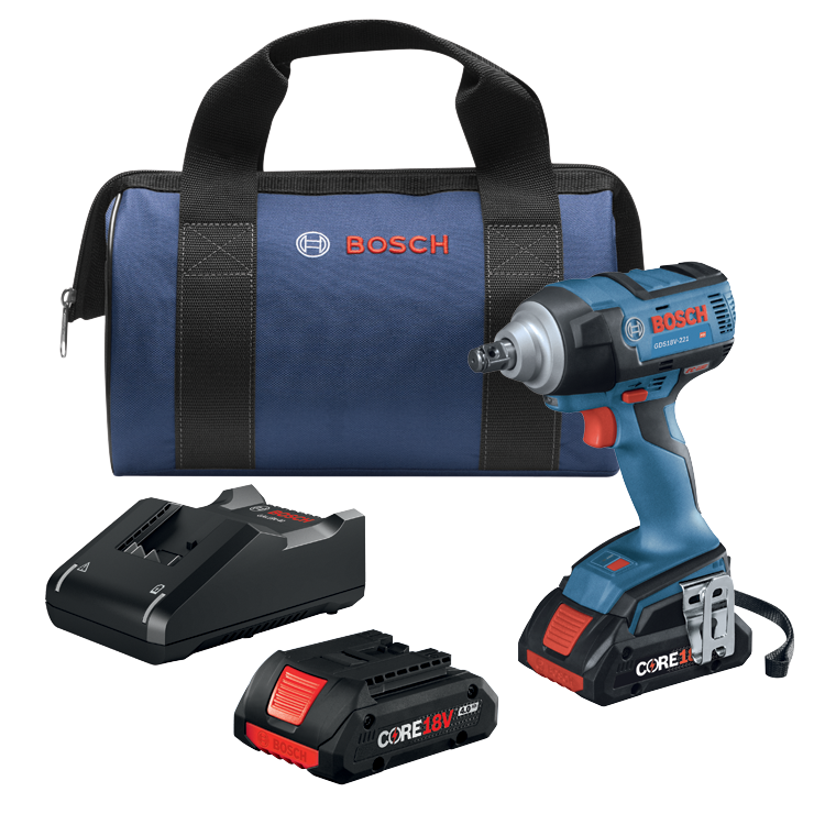 La boulonneuse EC sans balais 18 V de 1/2 po GDS18V-221B25 18 V EC Bosch avec bague de friction et trou traversant est conçue pour visser des boulons, écrous et ancrages avec un couple élevé. Cet boulonneuse dispose de la fonction ABR (Auto Bolt Release) arrêtant la rotation dès que le couple devient nul afin de prévenir la chute des boulons et écrous lors de leur desserrage. Cet outil est doté d’un système de percussion Bosch permettant de disposer d’une force de frappe élevée. Le moteur EC sans balais très performant assure une grande autonomie et fournit jusqu’à 221 pi-lb de couple, une fréquence de frappe à vide de 0 à 3 400 BPM et un régime à vide de 0 à 2 400 tr/min. Cette clé est particulièrement compacte et légère ; elle a une longueur de tête de 6,4 po et ne pèse que 2,77 lb. L’ensemble inclut deux batteries Compact CORE18V 4.0 Ah de nouvelle génération. La technologie de cellules 21700 a permis d’alléger les batteries tout en conservant la même puissance et la même autonomie. La batterie CORE18V est plus puissante qu’une batterie de 4,0 Ah classique à deux rangées de cellules bien qu’ayant deux fois moins de cellules. Elle est également dotée du système de gestion thermique CoolPack 2.0 pour une plus grande autonomie et une plus longue durée de vie.