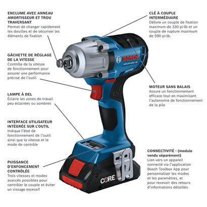 La clé à chocs 18V sans balais de 1/2 po à couple moyennement élevé GDS18V-330C Bosch est remarquablement performante pour visser des tirefonds dans des poutres épaisses, assembler des structures métalliques ou retirer des écrous de roue récalcitrants. Cette clé à chocs est dotée d’un porte-outil 1/2 po avec bague de friction et trou traversant pour des changements de douille rapides et un maintien parfait. Le moteur sans balais permet de visser avec un couple de serrage jusqu’à 330 pi-lb et de dévisser avec un couple de décollement de 590 pi-lb tout en bénéficiant d’une grande autonomie. Il dispose de plusieurs modes, notamment d’un mode Auto Stop (arrêt automatique), évitant tout serrage excessif et donc tout risque d’endommagement des pièces et vis. Des réglages spécifiques peuvent être paramétrés et mémorisés pour des certains types de vis, boulons et matériaux via l’application Bosch PRO360 (requiert un module de connectivité vendu séparément). Quand le mode boulon est activé, la fonction ABR (Auto Bolt Release) arrête la rotation dès que le boulon ou l’écrou est desserré afin d’éviter qu’il tombe accidentellement. La fonction connectivité (requiert un module spécial vendu séparément) ne permet pas seulement de paramétrer et personnaliser des modes et des réglages, elle permet aussi d’obtenir des informations spécifiques sur l’outil et son état. L’ensemble comprend deux batteries Advanced Power CORE18V® 4 Ah offrant une autonomie 2 fois plus élevée que la batterie BAT612 de 2,0 Ah de la précédente génération.