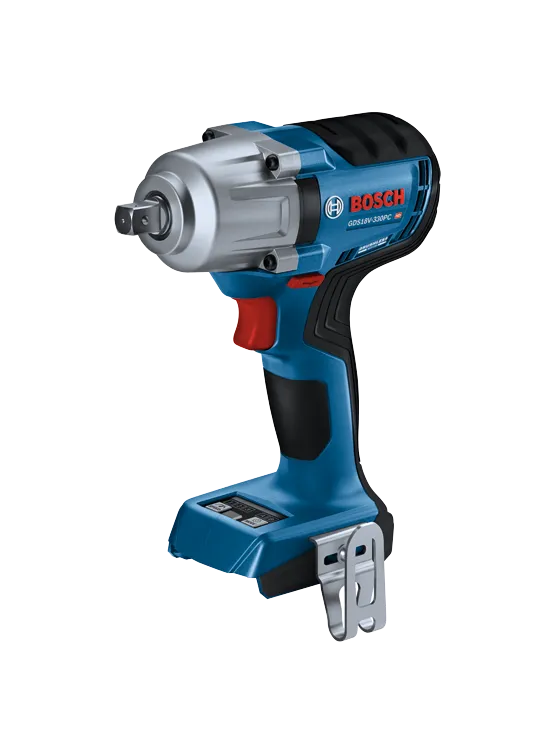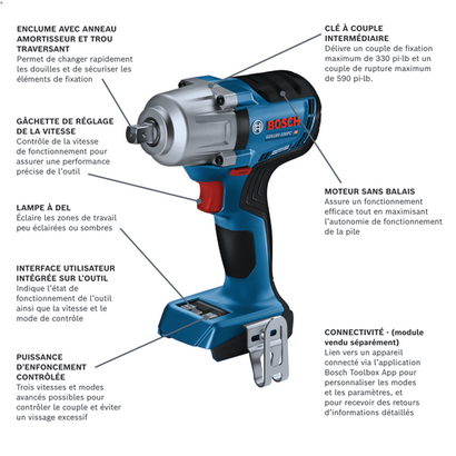 La clé à chocs 18V sans balais de 1/2 po à couple moyennement élevé GDS18V-330PC Bosch est remarquablement performante pour visser des tirefonds dans des poutres épaisses, assembler des structures métalliques ou retirer des écrous de roue récalcitrants. Cette clé à chocs est dotée d’un porte-embout de 1/2 po avec goupille de retenue permettant de fixer des douilles sans aucune clé avec un maintien parfait. Le moteur sans balais permet de visser avec un couple de serrage jusqu’à 330 pi-lb et de dévisser avec un couple de décollement de 590 pi-lb tout en bénéficiant d’une grande autonomie. Il dispose de plusieurs modes, notamment d’un mode Auto Stop (arrêt automatique), évitant tout serrage excessif et donc tout risque d’endommagement des pièces et vis. Des réglages spécifiques peuvent être paramétrés et mémorisés pour des certains types de vis, boulons et matériaux via l’application Bosch PRO360 (requiert un module de connectivité vendu séparément). Quand le mode boulon est activé, la fonction ABR (Auto Bolt Release) arrête la rotation dès que le boulon ou l’écrou est desserré afin d’éviter qu’il tombe accidentellement. La fonction connectivité (requiert un module spécial vendu séparément) ne permet pas seulement de paramétrer et personnaliser des modes et des réglages, elle permet aussi d’obtenir des informations spécifiques sur l’outil et son état. Il s’agit d’un ensemble ne comprenant que l’outil ; la batterie et le chargeur sont vendus séparément.