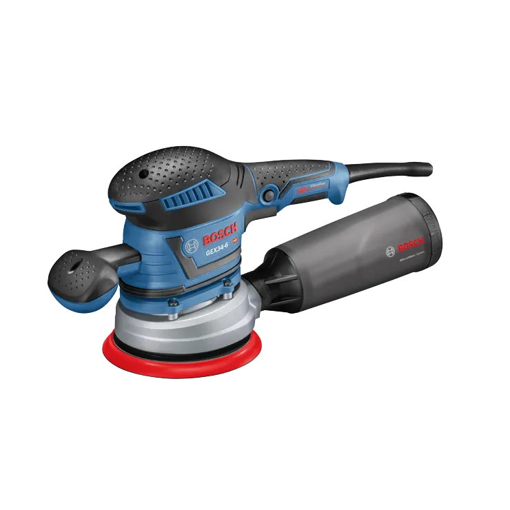 La ponceuse/polisseuse excentrique à multiperforation de 6 po GEX34-6N Bosch accepte quasiment toutes les marques de papier abrasif du marché grâce à son plateau à multiperforation. La ponceuse permet d’obtenir une très bonne qualité de surface grâce à une aspiration optimale de la poussière. L’aspiration améliorée de la poussière due à la multiperforation a aussi pour effet de multiplier par 2 la durée de vie du papier abrasif. Elle dispose d’un boîtier microfiltre avec filtre papier intégré et d’un raccord pour tuyau d’aspirateur. L’outil est doté d’un carter d’engrenage robuste en aluminium moulé sous pression et d’un plateau supporté par deux roulements pour réduire les vibrations. La molette de présélection de vitesse permet de faire varier la vitesse de la ponceuse entre 5 500 et 12 000 osc/min pour une adaptation parfaite au matériau et au type d’application. Afin de garantir un maintien ferme sur le plateau lors de son utilisation, le disque dispose d’un système de fixation auto-agrippant. La ponceuse a été conçue avec une partie supérieure à prise souple et un corps ergonomiques.