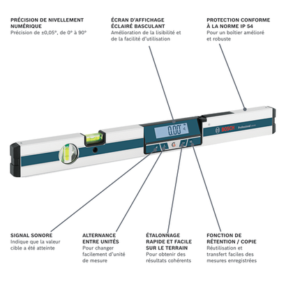 Le niveau numérique 24 po Bosch GIM 60 fournit une écran incliné illuminé pour une meilleure lisibilité, ce qui en fait le niveau numérique idéal pour les tâches difficiles ou dans les zones sombres. L'écran facile à utiliser pivote automatiquement. Avec indicateur sonore pour la mise à niveau ou à 90°, cet inclinomètre possède un bouton enregistrer/copier et une mémoire pour transférer les valeurs cibles vers d'autres zones du chantier. Il a une précision exceptionnelle, avec une exactitude du niveau à 0° ou 90° de ±0,05°. Les utilisateurs obtiennent des mesures précises en degré, en pourcentage ou en pieds et pouces, pour une bonne adaptabilité. Cet outil est doté d'un boîtier robuste avec protection IP 54, pour le protéger de la poussière sur les chantiers.