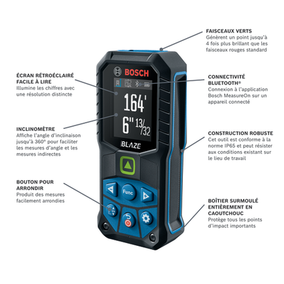 Ce télémètre laser de 165 pi à laser vert est un outil complet avec écran couleur facile à lire, grande précision, inclinomètre pour angles d’inclinaison et boîtier renforcé pour une grande longévité. Le GLM165-27CG BLAZE™ Bosch utilise la technologie laser verte permettant de générer des points jusqu’à 4 fois plus lumineux que les faisceaux rouges standard. L’inclinomètre affiche les angles d’inclinaison sur 360° pour des mesures d’angle et des mesures indirectes faciles. Doté d’une précision jusqu’à ±1/16 po, le laser inclut un bouton permettant d’arrondir les résultats de mesure à la fraction la mieux adaptée à l’application ainsi qu’un retour tactile pour les chantiers bruyants. Le télémètre laser dispose aussi de la fonctionnalité Bluetooth® permettant aux utilisateurs de transférer numériquement des valeurs mesurées vers un téléphone mobile ou une tablette par le biais de l’application mobile gratuite MeasureOn. Il possède en plus un surmoulage intégral en caoutchouc agissant comme une cage de sécurité. Conforme à l’indice de protection IP 65, il dispose d’un design ergonomique et d’une poignée souple. Au total 11 fonctions de mesure sont incluses, dont mesure de distances en temps réel, mesure de distances/surfaces/volumes et mesures indirectes, fonction addition/soustraction.