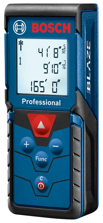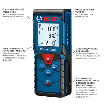 Le télémètre laser Bosch de 165 pi BLAZE™ Pro GLM165-40 est un outil très complet simple à utiliser. Doté d’un écran rétro-éclairé à lecture facile qui éclaire les valeurs de mesure, il intègre des fonctions de mesure de distances, de mesure de distances, superficies, volumes et de mesure indirecte. Il dispose par ailleurs d’une mémoire pour 10 mesures. Sa fonction addition/soustraction permet à l’utilisateur d’ajouter ou de soustraire des valeurs mesurées. Le BLAZE™ Pro inclut un mode de mesure en temps réel (mode par défaut) consistant à actualiser automatiquement l’affichage de distance à mesure que le télémètre se rapproche ou s’éloigne de la cible. Il dispose d’une technologie laser de précision et d’un mode de mesure en temps réel permettant d’effectuer des mesures rapides et fiables jusqu’à une portée de 165 pi pour estimer en quelques secondes le travail à effectuer. Sa précision est de ± 1/16 po. Il tient dans les poches, ce qui permet de l’avoir toujours à portée de main.