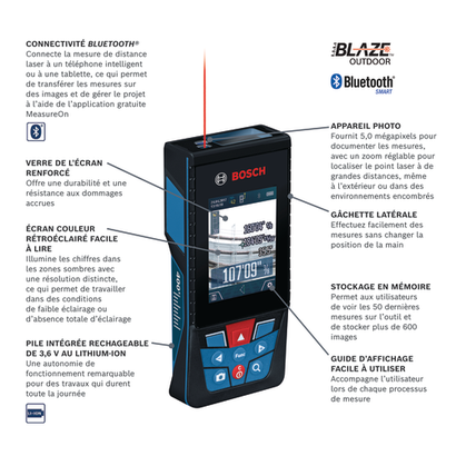 Le télémètre laser connecté pour applications extérieures GLM400CL BLAZE™ Bosch avec caméra est doté d’une caméra avec zoom réglable permettant de localiser le point laser dans des conditions lumineuses jusqu’à 400 pi. Transférez la documentation de mesure sur un téléphone intelligent ou une tablette avec Bluetooth® à l’aide de l’application MeasureOn de Bosch. Remarque : Les fichiers photo sont trop volumineux pour être transférés. Le télémètre laser extérieur dispose d’une fonction de mesure de distances en temps réel (fonction par défaut) ainsi que de fonctions de mesure de distances, surfaces, volumes et de mesure indirecte : elles sont toutes faciles à utiliser grâce à un affichage écran clair guidant tout au long du processus de mesure. Un inclinomètre intégré permet de déterminer l’angle d’inclinaison d’un toit et de confirmer lorsque l’outil est de niveau. Le télémètre laser dispose d’un écran de verre couleur rétro-éclairé à bonne lisibilité et renforcé, d’un guidage utilisateur convivial et de 11 fonctions de mesure, dont une fonction de mesure de distances en temps réel (fonction par défaut). Il permet aux utilisateurs de consulter les 50 dernières mesures sur l’outil et stocke plus de 600 images.