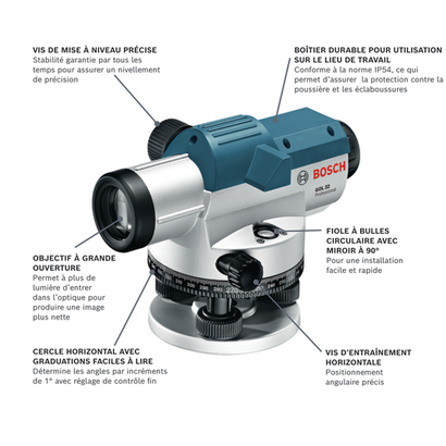 L’ensemble niveau optique automatique GOL 32 de Bosch comprend un compensateur de mise à niveau automatique, des pointeurs horizontaux et verticaux et des fils stadimétriques, un objectif avec agrandissement de 32x à grande ouverture pour une image claire. Portée : 400 pi, précision : jusqu’à 1/16 po à 100 pi, comprend : étui rigide, cache objectif, fil à plomb, outils d’ajustement.