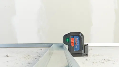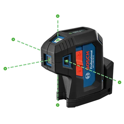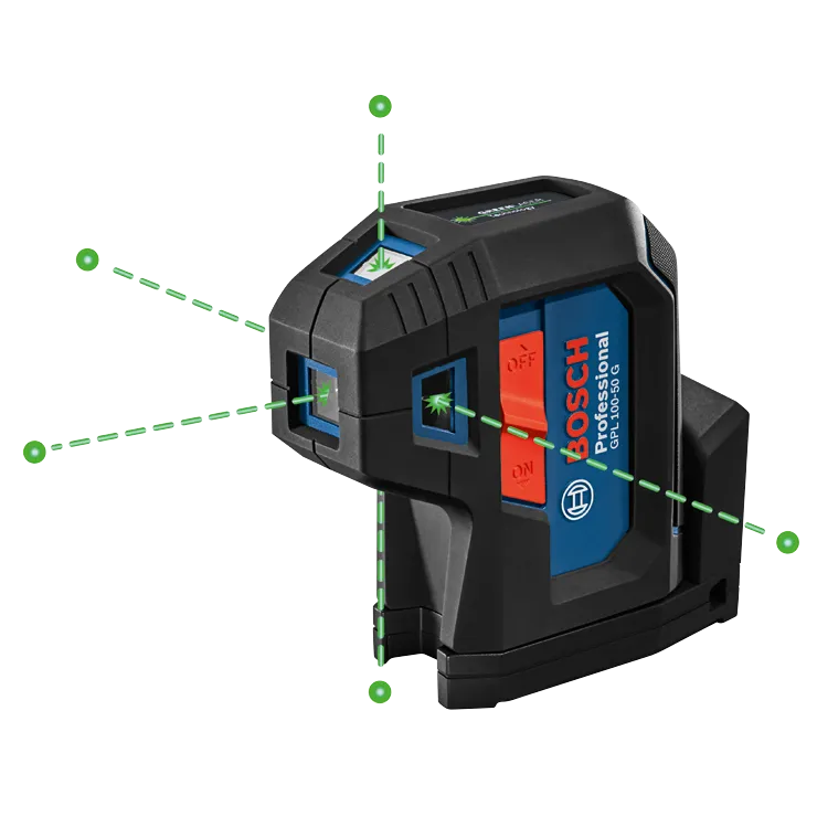 Le laser d’alignement cinq points auto-nivelant GPL100-50G Bosch offre une précision de ±1/8 po à 30 pi de distance pour les points d’aplomb vers le haut et vers le bas, les applications d’alignement et de mise à niveau (la précision du point vers le bas est de ±1/4 po à 30 pi de distance). Il bénéficie de la technologie laser vert permettant de générer des faisceaux laser jusqu’à 4 fois plus lumineux que les faisceaux rouges standards. La technologie VisiMax™ Bosch garantit en plus une luminosité optimale des faisceaux dans quasiment toutes les conditions d’utilisation sur les chantiers. Le laser d’alignement GPL projette aussi un point vers l’avant, ce qui permet une utilisation dans une multitude de positions. Les alignements peuvent ainsi être effectués plus rapidement qu’avec un fil à plomb manuel classique. Le laser dispose en plus de nombreuses caractéristiques lui conférant une grande longévité, notamment un système de calage pendulaire intelligent bloquant l’appareil quand il est éteint, une possibilité de rotation sur 360°, un coffret de transport rigide et un boîtier avec surmoulage caoutchouc. Le support multifonctions intégré possède de puissants aimants et permet de fixer ou positionner l’appareil presque partout.