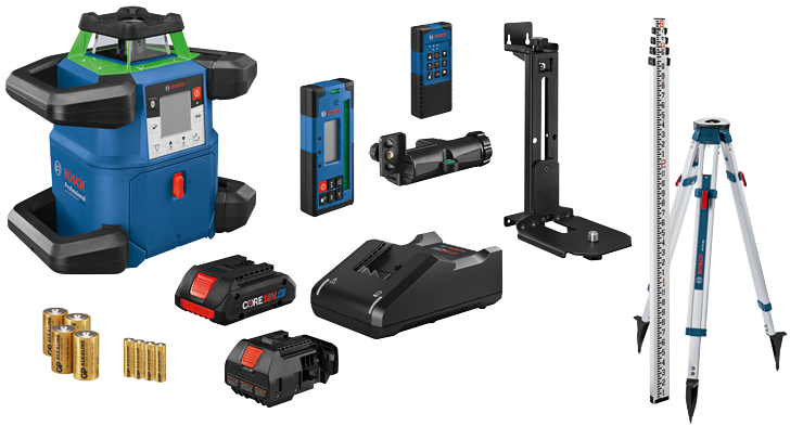 - Ensemble complet : inclut une télécommande, une batterie 18V 4 Ah, un chargeur, un adaptateur pour piles alcalines, un support mural, une cellule de réception laser, un trépied en aluminium, une mire robuste et un solide coffret de transport