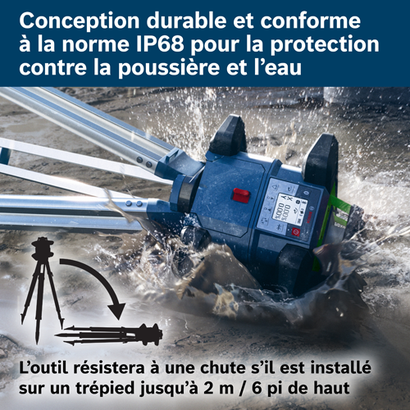 - Connectivité Bluetooth® : pour la connexion à l’application Levelling Remote Bosch gratuite sur un appareil mobile de type smartphone afin de commander à distance le mode veille, la fonction double pente manuelle et plus encore