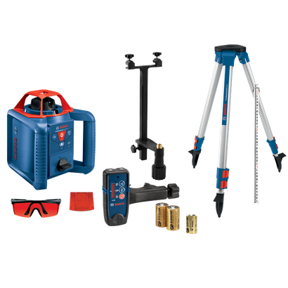 - Ensemble laser rotatif : comprend un laser rotatif horizontal/vertical avec portée maximale de 800 pi, une cellule de réception , un trépied, une mire, un support mural, des lunettes de vision laser, une cible et un coffret de transport rigide