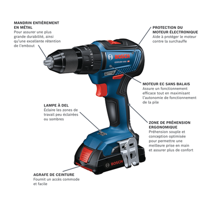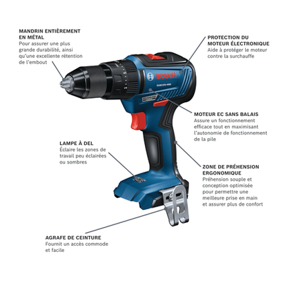 La perceuse/visseuse à percussion 18 V sans balais de 1/2 po GSB18V-490 Bosch est conçue pour les matériaux et les applications d’une grande exigence (comme le métal ou la maçonnerie).Cette puissante perceuse-visseuse à percussion sans fil dispose d’une sélection de mode rapide permettant de commuter rapidement entre les modes perforation, perçage et vissage, d’un embrayage avec 20 positions de présélection de couple pour ne pas endommager les têtes de vis. Son moteur sans balais performant offre une longue durée de vie et assure une grande autonomie. Elle délivre un couple de 490 po-lb, une fréquence de frappe à vide de 0 à 22 000 coups/min et dispose d’un variateur de vitesse et d’un engrenage 2 vitesses offrant le choix entre un couple élevé (0-460 tr/min) pour visser et un régime élevé (0-1 800 tr/min) pour percer. Le mandrin tout métal, amélioré, garantit une excellente tenue du foret et un transfert de couple parfait. La GSB18V-490 est dotée de l’Electronic Motor Protection Bosch, d’une DEL pour l’éclairage et d’un long clip de ceinture. Il s’agit d’un outil facile à manier avec une zone de préhension ergonomique.