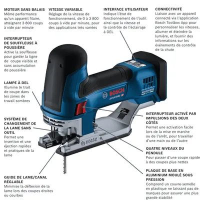 Cette scie sauteuse sans fil de 18 V a été optimisée pour les coupes courbées dans des matériaux épais. La scie sauteuse 18V GST18V-60BC à poignée champignon est dotée d’un moteur offrant un niveau de performance équivalent au filaire avec une cadence de coupe de 800 à 3 800 courses/min. Cette scie sauteuse à poignée champignon dispose d’un interrupteur à impulsion bilatéral facile à actionner tant par les droitiers que par les gauchers. Elle est équipée d’un guide/canal de lame réglable, qui minimise la déviation de la lame lors des coupes droites ou courbes. La scie sauteuse possède un mouvement pendulaire réglable dans 4 positions pour privilégier des coupes rapides ou des coupes nettes. Après connexion de la scie sauteuse à un téléphone mobile, l’utilisateur peut présélectionner la vitesse de rotation, allumer/éteindre la DEL d’éclairage et afficher des informations sur les chutes éventuelles (Drop Control) via l’application Bosch PRO360. Cette scie sauteuse dispose d’une régulation de vitesse adaptative assurant une amorce de coupe parfaite en réduisant automatiquement la cadence de coupe au moment où la lame entre en contact avec la pièce. Une fois que la lame touche la pièce, la scie réaccélère jusqu’à la cadence de coupe réglée pour une maîtrise et une précision parfaites. La scie sauteuse possède également une soufflerie activable et désactivable. Elle est compatible avec les rails de guidage Bosch et l’adaptateur de coupe circulaire. Elle dispose également de zones souples antidérapantes étendues et d’une poignée champignon de faible circonférence pour une maîtrise parfaite. Grâce à l’éclairage DEL et à la soufflerie, la ligne de coupe est toujours bien visible. La scie sauteuse dispose d’un système de changement de lame sans outil à accroche en T. La grande plaque de base en aluminium moulé sous pression est dotée d’un patin en plastique anti-marquage évitant de rayer la pièce.