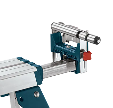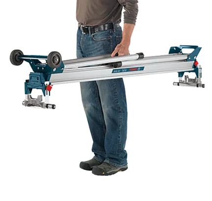 Le support pour scie à onglet à pieds repliables avec roues Bosch GTA3800 se définit par une robustesse industrielle. C’est un accessoire indispensable pour le montage et le déplacement des scies à onglet sur les chantiers sans avoir à enlever la scie. Ce support léger, résistant convient à la plupart des scies à onglet du marché, y compris les scies à onglet à un biseau et à deux biseaux de 12 po, 10 po et 8-1/2 po, ainsi que les scies des concurrents. Le support est équipé de rouleaux d’entraînement qui peuvent être réglés en hauteur pour s’adapter à celle de la scie à onglet de l’utilisateur. Des guides réglables sur le support compact de la scie à onglet prend en charge des pièces pouvant atteindre 16 pi et sont munis de dispositifs d’arrêts pour mettre en place une double coupe. Le pied niveleur réglable s’utilise sur des surfaces inégales. Le support est équipé de roues de transport pour déplacer facilement le support d’un endroit à un autre sans enlever la scie.