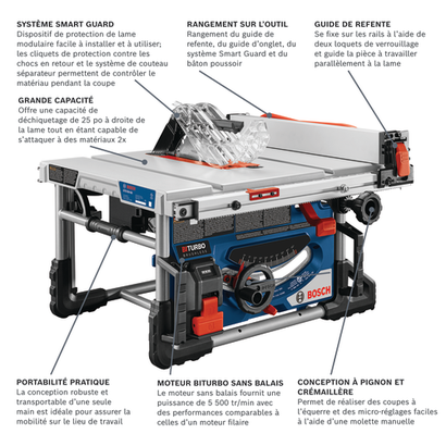 - Système Smart Guard : garde-lame modulaire, facile à installer et à utiliser; son couteau diviseur et ses taquets anti-rebonds fournissent un contrôle du matériau lors de la coupe