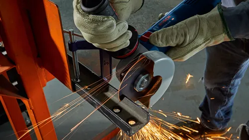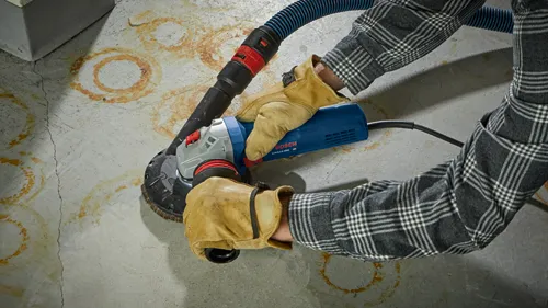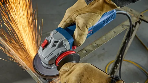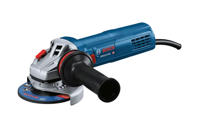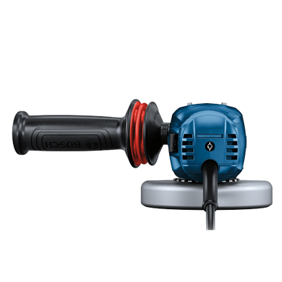 Cette rectifieuse angulaire ergonomique de 4-1/2 po possède un puissant moteur de 10 A et une zone de préhension de faible circonférence pour un confort et une maîtrise parfaites. La rectifieuse angulaire Bosch GWS10-450 donne de très bons résultats avec son régime à vide maximal de 11 000 tr/min assurant une productivité maximale dans les applications de meulage et de tronçonnage. Elle pèse 4,5 lb. Équipée de bobinages d’excitation revêtus d’époxy, de roulements à double étanchéité et d’un refroidissement direct du moteur, cette rectifieuse est construite pour offrir une plus longue durée de vie. Ses pignons coniques à denture hélicoïdale assurent une transmission fluide du couple. Pour plus de commodité, elle est dotée d’une poignée latérale antivibrations, d’un interrupteur coulissant blocable et d’un capot de protection réglable sans clé dans différentes positions pour permettre à l’utilisateur de travailler sous différents angles. La rectifieuse dispose sur la tête d’engrenage d’un collier de fixation amélioré, qui est désormais compatible avec tous les capots de protection pour métal et béton Bosch.