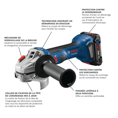 La Bosch GWS18V-8 est une rectifieuse angulaire ergonomique qui allie portabilité, performances et confort d’utilisation optimal. Son moteur sans balais délivre une puissance comparable à 8,0 A en filaire et des performances améliorées assurant une grande autonomie et productivité. Cette rectifieuse 18V de 4-1/2 po est dotée d’une protection anti-redémarrage évitant tout démarrage intempestif lors d’un changement de batterie, d’une fonction démarrage progressif réduisant le couple de démarrage et facilitant l’amorce des coupes ainsi que d’une protection contre les surcharges réduisant les risques de surchauffe et de surcharge du moteur. Elle intègre des pignons coniques à denture hélicoïdale assurant une transmission fluide du couple pour les applications de meulage. La rectifieuse dispose en plus d’un capot de protection réglable sans clé et d’une tête d’engrenage avec collier de fixation amélioré, désormais compatible avec tous les capots de protection Bosch pour métaux et béton. Particulière fine et dotée de revêtements softgrip, la rectifieuse possède une poignée latérale à deux positions et un blocage de broche. Cet ensemble inclut une batterie Advanced Power CORE18V® 4 Ah de nouvelle génération offrant une autonomie 2 fois plus élevée qu’une batterie BAT612 de 2 Ah de la précédente génération.