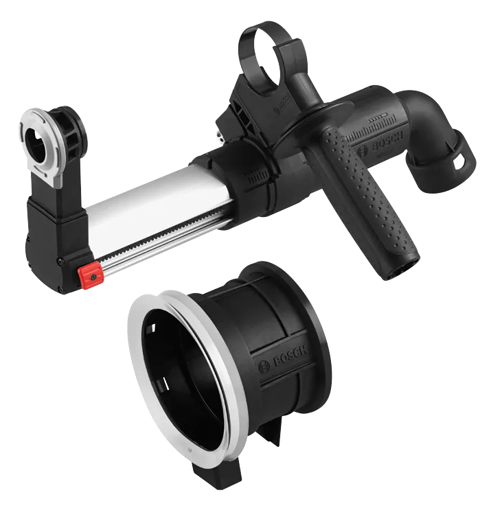 Le collecteur de poussière SDS-plus® de 3/4 po Bosch aspire efficacement la poussière lors de perçages avec des marteaux perforateurs Bosch. Le collecteur se fixe sur la plupart des marteaux perforateurs SDS-plus® Bosch grâce à une interface latérale unique. Doté d’un bras télescopique en métal rétractable avec précision, il peut être déplacé vers l’avant et vers l’arrière avec un collier de serrage en fonction de la longueur des forets. Il est conçu pour des profondeurs de perçage jusqu’à 4-3/4 po. À sa tubulure d’aspiration peut être raccordé directement un tuyau d’aspiration de 1-3/8 po. En combinaison avec un adaptateur adéquat (disponible séparément), il est également possible de raccorder des tuyaux d’aspiration de 1-1/4 po ou 2 po.
