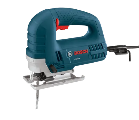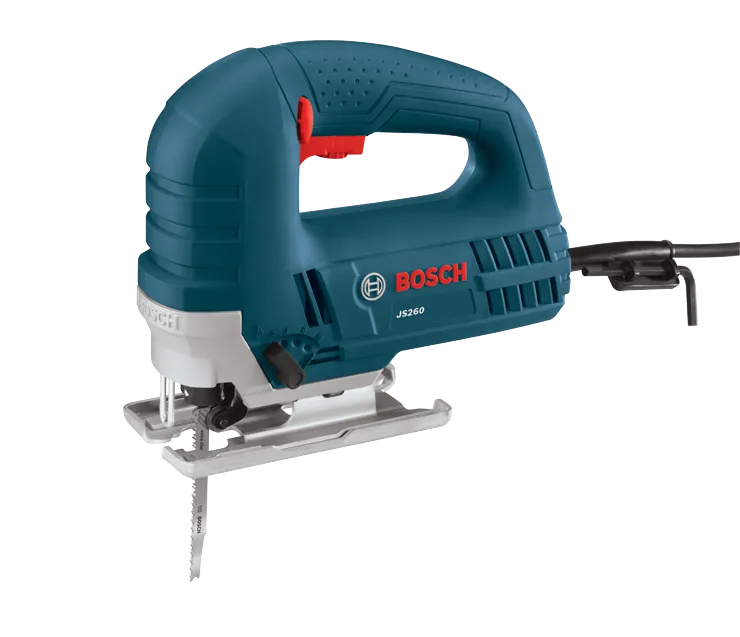 La scie sauteuse à poignée supérieure Bosch JS260 possède une plaque de base robuste pour des coupes de précision, ainsi qu’un moteur de 6,0 A et un variateur de vitesse. Le moteur robuste produit jusqu’à 3 100 courses/min avec une longueur de course de 3/4 po. La molette permet de contrôler la vitesse maximale, tandis que la gâchette permet de réguler la vitesse de fonctionnement. Cette scie sauteuse dispose d’un système de plongée à faibles vibrations pour une grande précision de coupe et un fonctionnement sans à-coups. Elle est dotée d’une grande plaque de base en acier épais. La fixation de la lame multidirectionnelle de la JS260 offre une prise supérieure à celle des lames à tige en T (mais elle n’est pas compatible avec les lames à tige en U). Le système de changement de lame à tige en T sans clé permet une insertion et un retrait rapides de la lame. L’outil possède une soufflerie toujours activée pour une visibilité optimale de la ligne de coupe ainsi qu’un bouton de verrouillage ambidextre.