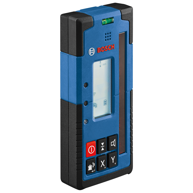 La cellule de réception LR40 Bosch est conçue pour augmenter la portée des lasers rotatifs GRL4000-80CH et GRL4000-80CHV et permettre une détection jusqu’à 2 000 pi de distance. Elle est dotée de deux écrans LCD rétro-éclairés (un sur chaque face) pour une utilisation dans les endroits sombres et à l’extérieur. Elle dispose de boutons « axe X » et « axe Y » permettant des calculs d’élévation et de déblai ou remblai suivant les deux axes jusqu’à un angle de ± 8,5°. L’écran comporte de nombreux affichages faciles à lire, notamment des affichages de direction (flèches vers le haut/vers le bas), un affichage ligne de centrage, un affichage niveau de précision, un affichage niveau des piles et un affichage signal audio. Il possède aussi des DEL assurant une lecture facile et une utilisation simple. La très grande zone de détection laser aide à trouver le faisceau laser très rapidement et facilite de ce fait les mises à niveau. La cellule de réception intègre également des aimants offrant une bonne adhérence sur les surfaces en métal, un haut-parleur réglable, un niveau à bulle, un crochet de fixation et un revêtement caoutchouté ergonomique pour un maximum de confort.