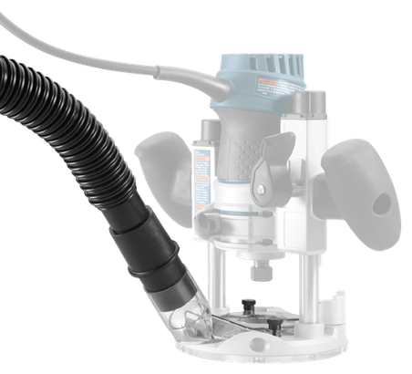 La hotte à poussière PR012 est destinée à être utilisée avec la base en plongée pour toupie portative PR011. Facilite grandement la propreté de l’aire de travail. La PR012 peut être fixée à la base en plongée avec le boyau faisant face à l’avant ou à l’arrière de la base. La machine PR011 se branche directement aux tuyaux Bosch. L’adaptateur de boyau d’aspirateur VAC002 est inclus pour permettre de brancher la machine PR011 à des tuyaux d’aspirateur de 1-1/4 po et 1-1/2 po.