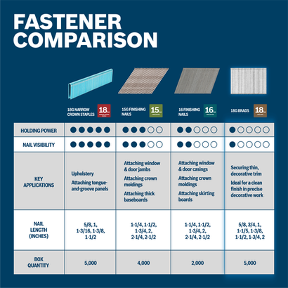 Fastener comparison chart with 18G Narrow Crown Staples, 15G Finishing Nails, 16G Finishing Nails, and 18G Brads, detailing holding power, nail visibility, key applications, nail length, and box quantity.