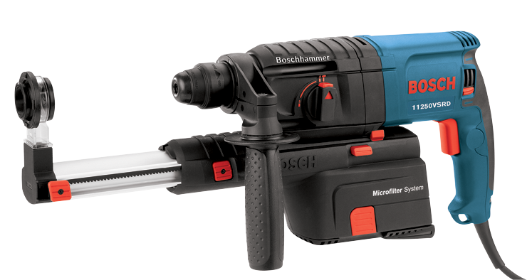 The Bosch 11250VSRD SDS-plus® Bulldog™ 7/8 In. Rotary Hammer with Dust Collection features a dual-fan system with a second set of fan blades for outstanding air suction for more dust collection. The microfilter system has an integrated paper filter captures a high volume of silica dust for reduced exposure. The hammer itself weighs only 5.5 Lbs., but it has a muscular 6.1 Amp motor that provides 1.7 Ft.-Lbs. of impact energy. It has an ergonomic pistol-grip handle, which provides outstanding comfort and performance in hard-to-reach or all-day applications. It has a dual-mode selector for drilling versatility – rotary hammer or rotation-only mode. The 11250VSRD has a rotating brush plate for longer brush life and a variable-speed reversing trigger for accurate bit starting. The SDS-plus® system provides for tool-free bit changes with automatic bit locking. It has an integral clutch to minimize risky torque reaction.