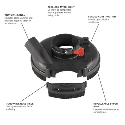 The Bosch 18SG-7 7 In. concrete surfacing attachment works with the Bosch 7 In. angle grinders. The guard and grinder can be part of the end-to-end Bosch PRO+GUARD™ Protection System, along with attachments, dust extractor and respiration protection (to be used as a basic summary; always use products in accordance with the ownerʼs manual and OSHA Rule 1926.1153 Table 1). This attachment is tool free, with a removable nose piece and a replaceable brush ring for low cost maintenance.