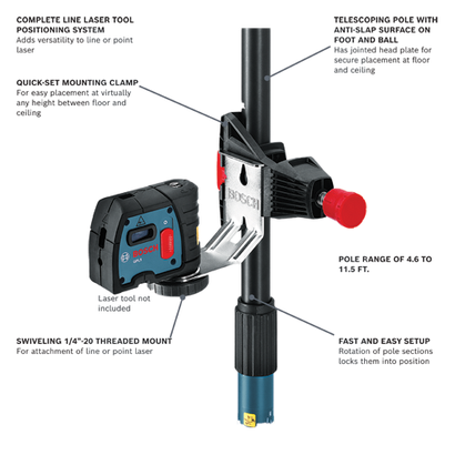- Complete laser tool positioning system – pole, clamp and tool mount are all included