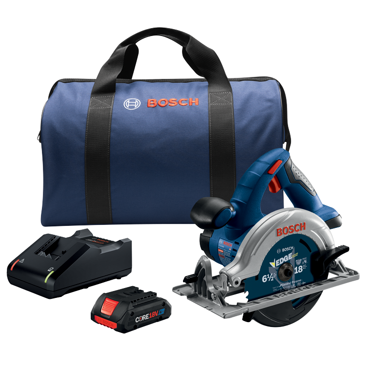 The Bosch CCS180-B15 18V 6-1/2 In. Circular Saw Kit with a CORE18V 4 Ah Advanced Power Battery features a circular saw that easily cuts through 2 In. material. This powerful tool can easily cut through 2x (“two by”) material across entire bevel range of 50°. Its ergonomic main handle that is angled for ease in pushing the saw forward, and a dust blower helps keep the cut line visible. The cordless saw also includes a simple straightforward depth gauge and bevel scale and an anti-snag lower guard to allow easy entry into the workpiece. With a weight of only 6.6 Lbs. (tool only, not including battery), this power saw is an excellent choice pros such as roofers, framers, or deck-builders who often have tough cuts in close or difficult spaces. An electronic brake stops the blade quickly for reduced down time between repeated cuts. The next-gen Lithium-ion CORE18V Advanced Power Battery matches the power of the original two-layer 4.0 Ah battery with half the number of cells. The battery features high-power 21700 cells that deliver great power, combined with advanced battery design for greater efficiency. The CORE18V 4 Ah battery features the Bosch-exclusive CoolPack 2.0 heat-management system and cutting-edge engineering.