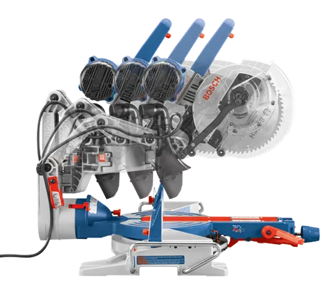 - Articulated hinge arms – reduce the saw’s front-to-back footprint by up to 10 In. compared to slide saws with similar capacities