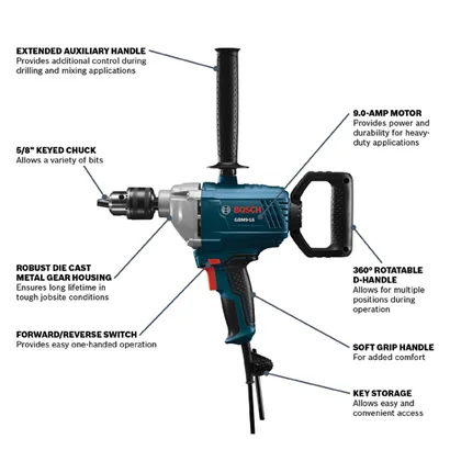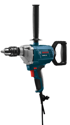 The Bosch GBM9-16 Mixer handles a wide variety of materials, from paint to plaster and more. It has variable speed control, and it has both forward and reverse operation at 0-700 no-load RPM. The all-ball bearing motor and precision-cut steel gears deliver plenty of power for high-torque mixing jobs. Higher speed is best for materials with low viscosity such as paint or sealing compounds. Lower speed, higher torque mixing works for mortar or epoxy resin. It features a 360° rotatable D handle, for maximum comfort. It diminishes vibration while allowing the user to adjust to the desired position. The heavy-duty 5/8 In. keyed chuck allows the tool to support a large variety of accessories. It features a tough, lightweight magnesium front housing for durability. It has a two-finger trigger design for easier mixing.