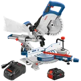 This Bosch brushless miter saw combines professional cutting capacity with outstanding portability to deliver a truly mobile, cordless solution to the jobsite. The GCM18V-08 8-1/2 in. is a single-bevel, sliding compound miter saw delivering a 3-5/8 In. nested crown cutting capacity, cutting from 47° left to 47° right against the fence, which is exceptional range for a cordless 8-1/2 In. miter saw. At a manageable 31.5 Lbs. (tool only, not including battery), this saw features easy portability while still providing a 10-5/8 In. crosscut capacity. In testing, the saw delivers 377 cuts per charge with a CORE18V® High Power Battery. The kit includes a CORE18V® 8 Ah High Power Battery, which delivers 100% more runtime and over 75% more power than the CORE18V® 4 Ah battery for high-demand applications. With an accurate laser guide system to precisely align the cut line to the blade, the saw is engineered with precisely centered sliding bars, leading to a very smooth and easy saw sliding. It provides a dust chute and dust bag, providing efficient dust collection.