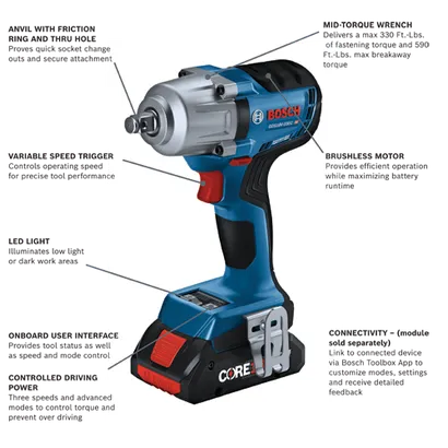 The Bosch GDS18V-330C 18V Brushless 1/2 In. Mid-Torque Impact Wrench delivers outstanding performance, whether driving lag bolts through heavy lumber, assembling metal structure, or removing stubborn lug nuts. This impact wrench has a 1/2 In. drive with a friction ring and thru-hole for quick socket changes and secure attachment. The brushless motor delivers up to 330 Ft.-Lbs. fastening torque and 590 Ft.-Lbs. breakaway torque while providing long runtime. Modes such as Auto Stop help prevent over driving, which can damage materials and fasteners. Presets for specific bolts, screws and materials can be customized and saved to the tool via the Bosch PRO360 App (connectivity module sold separately). When reversing in bolt mode, Auto Bolt Release senses when the bolt is loosened and stops rotation to help prevent accidental dropping of bolts and nuts during removal. In addition to customizable settings and modes, connectivity (module sold separately), provides tool specific information and feedback. The kit features two CORE18V® 4 Ah Advanced Power Batteries, which deliver 2x the runtime compared to previous generation BAT612 2.0 Ah battery.