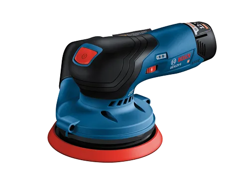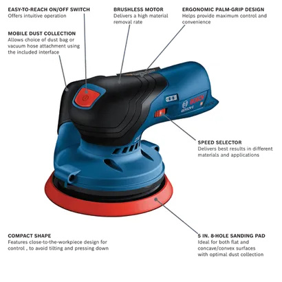This 12V Max random orbit sander is designed to tackle hard-to-reach work areas with power and control. It features a well-balanced ergonomic palm grip, which allows your hand to be closest to the work material to avoid tilting and pressing down, for best results. The easy-to-reach on/off switch offers intuitive operation. The Bosch GEX12V-5 Brushless 5 In. Random Orbit Sander has a powerful 12V Max brushless motor, and it is engineered for professional applications. The speed selector delivers best results in different materials and applications. The sander has a 5 In. 8-hole sanding pad, which provides optimal dust collection when the sander is attached to a vacuum or a dust bag. The dust pad is ideal for both flat and concave/convex surfaces. The included dust bag allows mobile dust collection, while the tool has an interface for vacuum hose attachment. It also has soft-start technology, constant speed and a hook-and-loop backing pad. The sander has a compact shape with close-to-the-workpiece design for control in hard-to-reach areas.