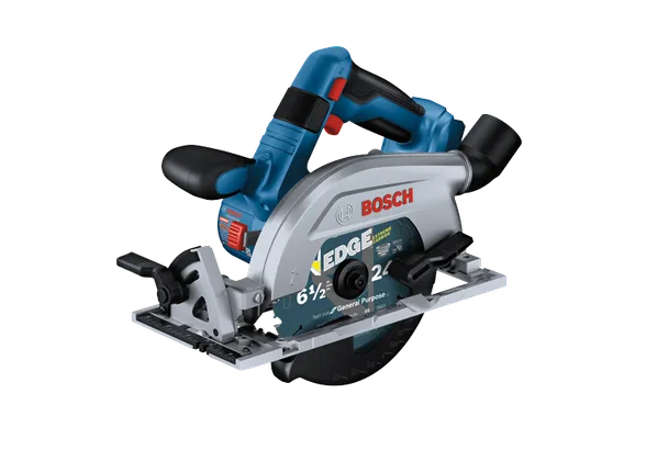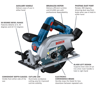 This circular saw has a 2-1/4 In. cut capacity, cutting through 2X (“two by”) material across the entire bevel range. The Bosch GKS18V-22L 18V Blade-Left 6-1/2 In. Circular Saw has a brushless motor, which delivers efficient runtime and 5,000 rpm with professional dependability. This compact saw weighs only 6.1 Lbs. (tool only, not including battery). The saw’s blade-left design provides a cleaner view of the blade for better cut-line visibility when held in the right hand. When held in the left hand it provides great balance and control for cross cuts. The auxiliary handle improves stability and ergonomic handling in either hand. The saw's convenient depth gauges are visible from either side of the saw and it has a 0-50 degree bevel range, with detents at 0, 45 and 22-1/2 degrees. It features two convenient depth gauges, one on the lower guard and one by the housing so depth is visible on either side of the saw. It has an electronic convenience brake for less downtime between cuts. The 360 degree pivoting dust port directs dust away from the body when the saw is held in either hand. This saw also features a cut-line LED to illuminate workpiece cutting area for improved cut-line visibility. It includes an on-board blade-change wrench and spindle lock for easy blade changes.