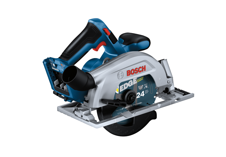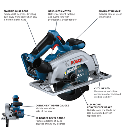 This circular saw has a 2-1/4 In. cut capacity, cutting through 2X (“two by”) material across the entire bevel range. The Bosch GKS18V-22 18V Blade-Right 6-1/2 In. Circular Saw has a brushless motor, which delivers efficient runtime and 5,000 rpm with professional dependability. This compact saw weighs only 6.1 Lbs. (tool only, not including battery). The auxiliary handle improves stability and ergonomic handling in either hand. The saw's convenient depth gauges are visible from either side of the saw and it has a 0-50 degree bevel range, with detents at 0, 45 and 22-1/2 degrees. It features two convenient depth gauges, one on the lower guard and one by the housing so depth is visible on either side of the saw. It has an electronic convenience brake for less downtime between cuts. The 360 degree pivoting dust port directs dust away from the body when the saw is held in either hand. This saw also features a cut-line LED to illuminate workpiece cutting area for improved cut-line visibility. It includes an on-board blade-change wrench and spindle lock for easy blade changes.