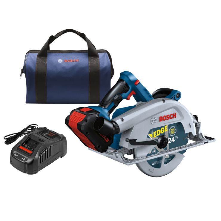 This circular saw delivers corded performance from an 18V cordless 7-1/4 In. saw. The Bosch GKS18V-25C 18V 7-1/4 In. BITURBO Brushless™ Circular Saw has a 2-1/2 In. cut capacity, easily cutting through 2X (“two by”) material across the entire bevel range. This circ saw is part of the PROFACTOR™ System, which pairs BITURBO Brushless™ Technology with a CORE18V® High Power Battery. BITURBO Brushless™ Technology is a high-performance motor and drive-train system designed to deliver power comparable to high-demand corded tools. The saw features connectivity (module sold separately), which links users to a connected device via the Bosch PRO360 App to receive detailed feedback. It has a 0-50° bevel range while the auxiliary handle improves stability and handling. It has an electronic convenience brake for less downtime between cuts and a 360° pivoting port directing dust away from the body when the saw is held in either hand. The kit includes a CORE18V® 8 Ah High Power Battery, which delivers 50% more runtime and over 75% more power than the CORE18V® 4 Ah battery, powering high-demand applications.