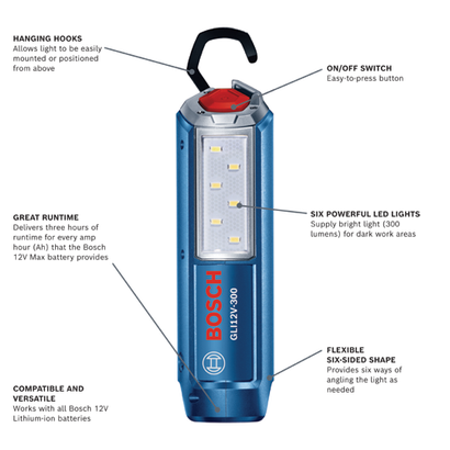 The Bosch GLI12V-300N 12V Max Worklight is a compact, lightweight and bright cordless light. It provides six hours of illumination with a 2.0 Ah battery (not included) for example – delivering 180 minutes of runtime for every amp hour (Ah) that the Bosch 12V Max battery provides. This flexible worklight lights up a large work area, and it keeps the area lit for hours. The 300-lumen is bright, and it can illuminate a dark work corner. It weighs only 0.36 Lbs. (tool only, not including battery). The light is six sided for best positioning, and it provides a hook for easy hanging. It features six LEDs for bright 300-lumen illumination. This is a bare tool; battery and charger are sold separately.