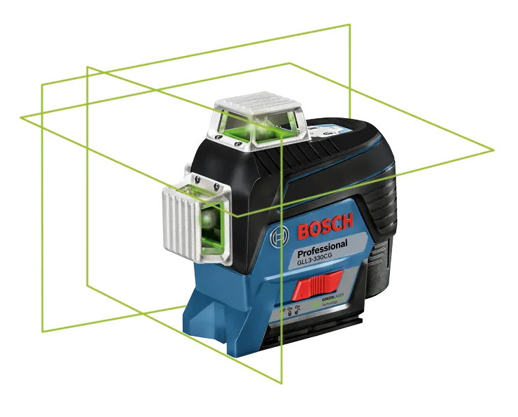 The Bosch GLL3-330CG 12V Max 360° Connected Green-Beam Three-Plane Leveling and Alignment-Line Laser provides an all-in-one level and alignment solution for one-person job setup. The leveling laser generates three green-beam laser chalk lines in 360° laser planes – one horizontal and two vertical. With Bluetooth® connectivity, users can control the setup of the laser from across the room with their smart phone and the free Bosch Leveling Remote App. The laser offers dual power technology, employed the included Bosch 12V Max Lithium-ion battery for extended runtime, or with four AA alkaline batteries. The laser has a working range of up to 200 Ft. diameter, and with pulse mode the range extends up to 330 Ft. (diameter) with the optional LR8 receiver. This laser features VisiMax™ Technology to drive maximum line visibility, CAL Guard for calibration assurance and robust over-molded construction to withstand rainy or dusty jobsite conditions.