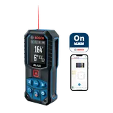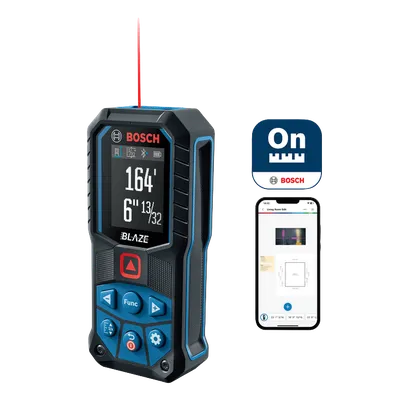 This 165 Ft. laser measure is a fully featured tool with an easy-to-read color display, great accuracy, an inclinometer for tilt angle and reinforced housing for durability. The Bosch BLAZE™ GLM165-27C features an inclinometer, which shows the tilt angle up to 360° for easy angle and indirect measurements. The laser has accuracy up to ±1/16 In., plus it includes a rounding button that rounds the measurement to the fraction that best suits the application and haptic feedback for loud jobsites. The digital laser measure also offers Bluetooth® functionality, so users can digitally transfer measurements to a smartphone or tablet through the free MeasureOn app. It also has full rubber overmold housing, designed to be similar to a roll cage. It is IP65 rated and has an ergonomic design for better grip. It includes 11 different measuring functions, including real-time length, length, area, volume and indirect functions, and addition/subtraction capability.