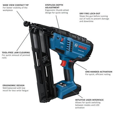 The Bosch GNH18V-15MA 18V Brushless 15-gauge Angled Finish Nailer delivers power and precision in a cordless solution. Compact and ergonomically designed, the 15-gauge angled finish nailer operates at a 34-degree angle giving workers the flexibility to access tight spaces, while also helping reduce worker fatigue. The efficient, brushless motor delivers the power to consistently sink 15-gauge angled finish nails ranging from 1-¼ In. to 2-½ In. which makes it ideal for fastening interior trims, crown moldings, baseboards, window and door casings, and other dense wood applications. The 15-gauge finish nailer features an angled magazine with a capacity of 105 nails. When paired with a CORE18V 4 Ah battery (sold separately), it can fasten up to 1,200 nails per charge, ensuring extended productivity. One-handed activation simplifies operation for quick and hassle-free nailing that is suitable for both right- and left-handed users. Equipped with a large viewing window and a no-mar contact tip, the 15-gauge angled finish nailer provides superior line of sight, helping minimize costly mistakes by giving workers improved sight of the workpiece while in use. The dry-fire lockout feature automatically stops operation when down to the last five nails. This not only prevents blank firing but also safeguards the workpiece from potential damage. Make easy and precise adjustments to the depth setting with the ergonomic thumb wheel. Additionally, downtime is minimized as jammed nails can be quickly cleared through a tool-free release mechanism while on the job. An intuitive user interface allows for easy toggling between single and bump-fire modes, turns the LED light on and off, and informs the worker of scheduled maintenance of the tool. An integrated heavy-duty belt hook provides easy portability and storage between tasks.