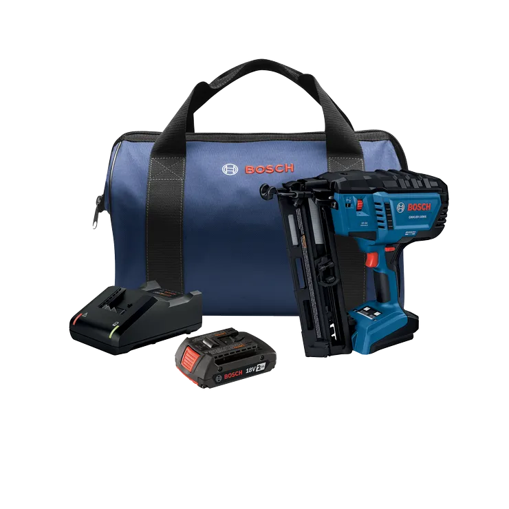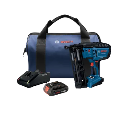 The Bosch GNH18V-16MA 18V Brushless 16-gauge Angled Finish Nailer delivers power and precision in a cordless solution. Compact and ergonomically designed, the 16-gauge angled finish nailer operates at a 20-degree angle giving workers the flexibility to access tight spaces, while also helping reduce worker fatigue. The efficient, brushless motor delivers the power to consistently sink 16-gauge angled finish nails ranging from 1-¼ In. to 2-½ In. which makes it ideal for fastening interior trims, crown moldings, baseboards, window and door casings and other dense wood applications. The 16-gauge finish nailer features an angled magazine with a capacity of 105 nails. When paired with a CORE18V 4 Ah battery (Kit includes 2Ah battery; 4 Ah battery sold separately), it can fasten up to 1,600 nails per charge, ensuring extended productivity. One-handed activation simplifies operation for quick and hassle-free nailing that is suitable for both right- and left-handed users. Equipped with a large viewing window and a no-mar contact tip, the 16-gauge angled finish nailer provides superior line of sight, helping minimize costly mistakes by giving workers improved sight of the workpiece while in use. The dry-fire lockout feature automatically stops operation when down to the last five nails. This not only prevents blank firing but also safeguards the workpiece from potential damage. Make easy and precise adjustments to the depth setting with the ergonomic thumb wheel. Additionally, downtime is minimized as jammed nails can be quickly cleared through a tool-free release mechanism while on the job. An intuitive user interface allows for easy toggling between single and bump-fire modes, turns the LED light on and off, and informs the worker of scheduled maintenance of the tool. An integrated heavy-duty belt hook provides easy portability and storage between tasks. The kit features a standard 18V 2 Ah Battery and 18V Standard Battery Charger.