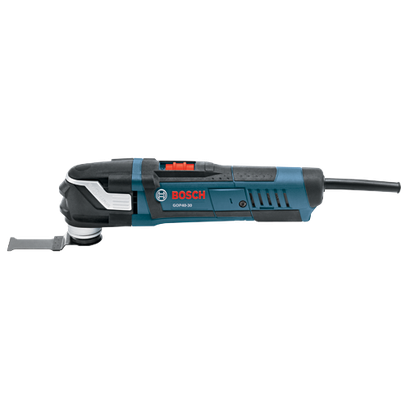 The Bosch GOP40-30C StarlockPlus®® Oscillating Multi-Tool Kit includes a tool that has the Starlock® next-generation 3-D tool-accessory interface, which produces best-in-class accessory grip, making it the new professional standard in oscillating tool performance. With more contact surface area between the tool and accessory, the Starlock® interface is a cupped 3-D tool-accessory connection that delivers greater torque transfer for an expanded work capacity. The no-touch blade-change system makes it easy to attach, remove or reposition blades. The professional-grade 4.0 Amp motor delivers a top speed of up to 20,000 oscillations per minute, and the tool provides a 3.0° oscillating arc. A variable-speed dial allows the user to set the optimal speed for the task at hand, and Constant Response circuitry maintains the desired speed under load This robustly constructed tool has reinforced gearing for more durability, less vibration and optimal force transmission. At only 3.3 Lbs., this light and compact tool reaches tight spaces, provides comfortable ergonomic grip zones and has an LED light for illumination in dark work areas. It is ideal for flush cuts such as door-jamb cuts (using various plunge or segment blades). The GOP40-30 provides outstanding versatility – utilizing the many Starlock® and StarlockPlus®® accessories to handle flush-cutting, plunge-cutting, sanding, grinding and many other tasks related to a wide array of materials. For compatibility with StarlockMax®® accessories, which perform industrial-grade applications, Bosch offers the GOP55-36 Oscillating Multi-Tool.